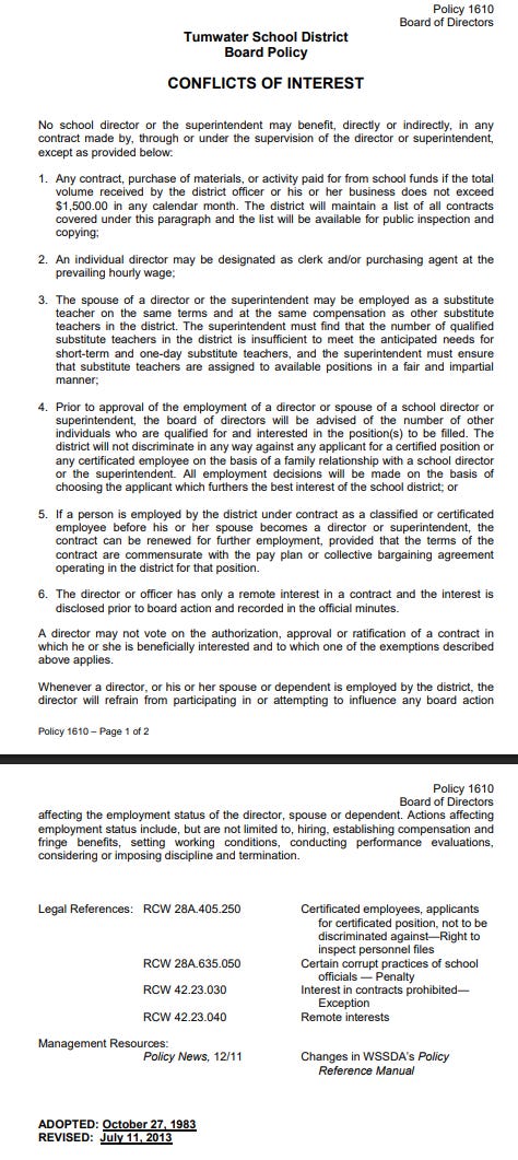 When questions were raised by Director Beard regarding a conflict of interest, Taylor referenced policy 1610: